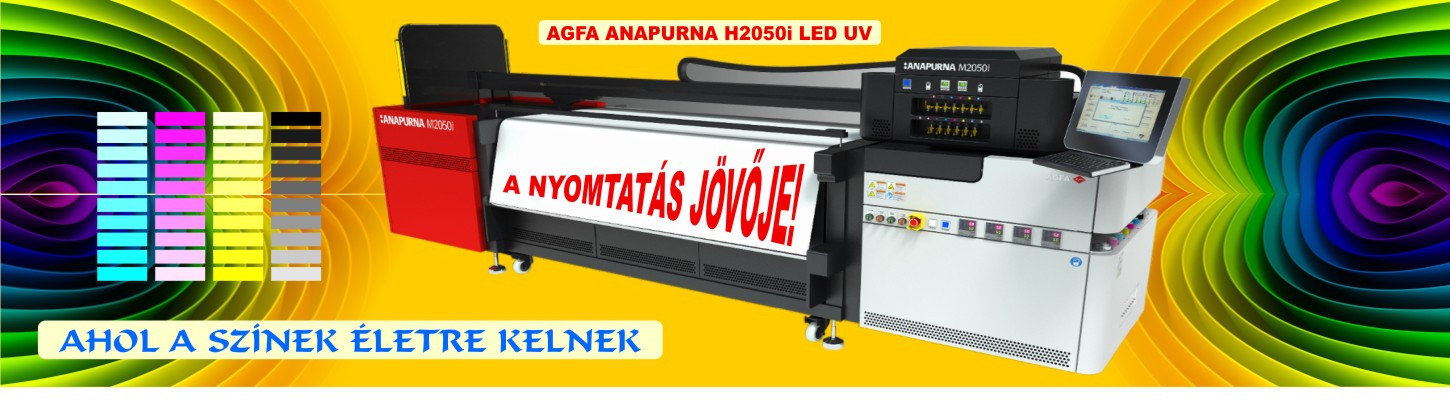 Több mint 20 éves szakmai múlttal készítünk különböző nyomdai termékeket. Legújabb fejlesztéseink közé tartozik a LED UV technológiás Agfa Anapurna nagy formátumú hybrid nyomtatónk. A hybrid kialakításnak köszönhetően, tekercses és táblás alapanyagokra is tudunk nyomtatni. Az UV fényre szilárduló festék különösen hosszú élettartamú és napfény hatására sem veszít az eredeti színdinamikájából.